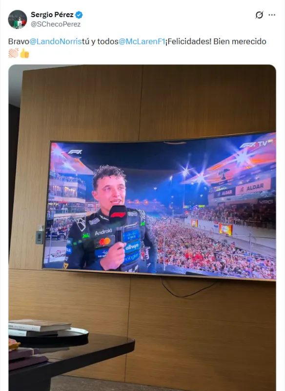 Tras finalizar la competencia en medio oriente, uno de los primeros en felicitar al piloto de la escudería de McLaren, fue el ahora miembro de Cadillac, Sergio ‘Checo’ Pérez. El mexicano publicó una imagen en redes sociales viendo la carrera y con un mensaje para Norris.
