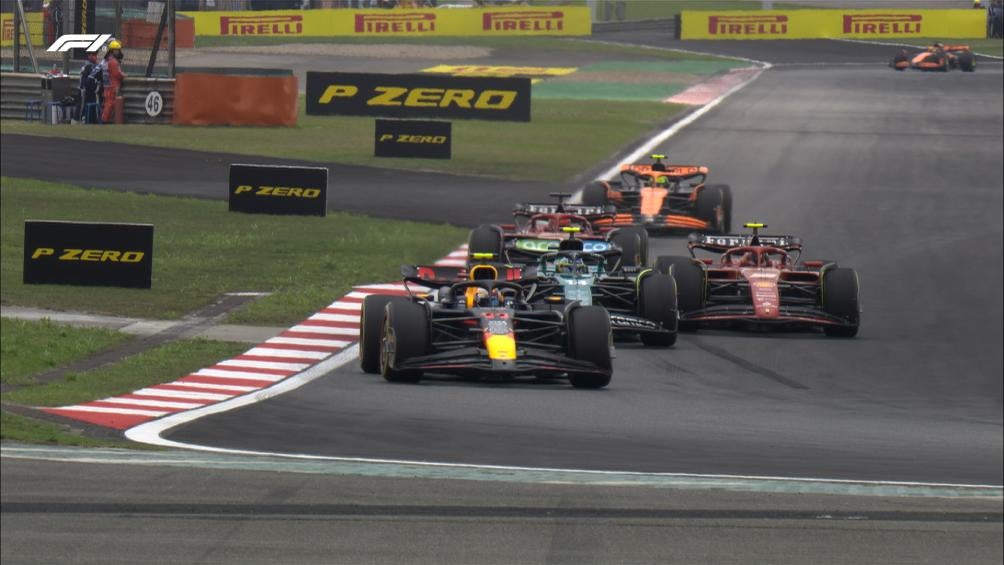 Verstappen superó en la Vuelta 7 a Fernando Alonso y dos giros más tarde al piloto de Mercedes, quien no pudo competir contra el RB20 y en la Vuelta 10 ya estaba atrás por dos segundos. Sin embargo, se vio favorecido por la batalla de los pilotos que venían detrás.
