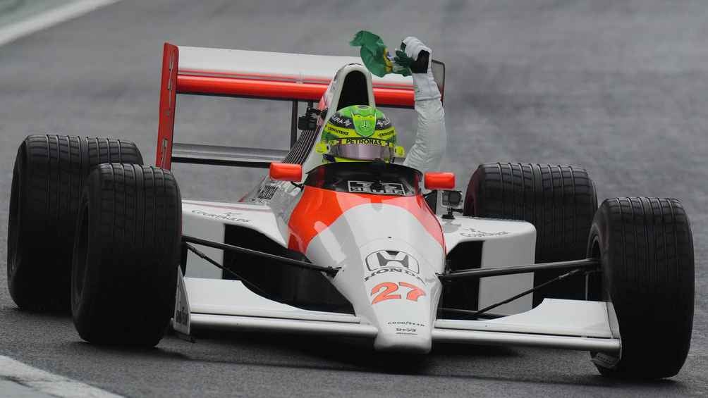 Utilizando un uniforme blanco de carreras, Hamilton realizó algunas vueltas bajo la lluvia a bordo del histórico McLaren MP4/5B que condujo Senna durante su campaña ganadora en 1990, en la cual superó a Alain Prost de Ferrari. El piloto de Mercedes fue mostrado con la bandera a cuadros por la gimnasta campeona olímpica Rebeca Andrade mientras él llevaba la bandera brasileña en su mano derecha, imitando lo que hacía el legendario tres veces campeón del mundo luego de varias de sus victorias.