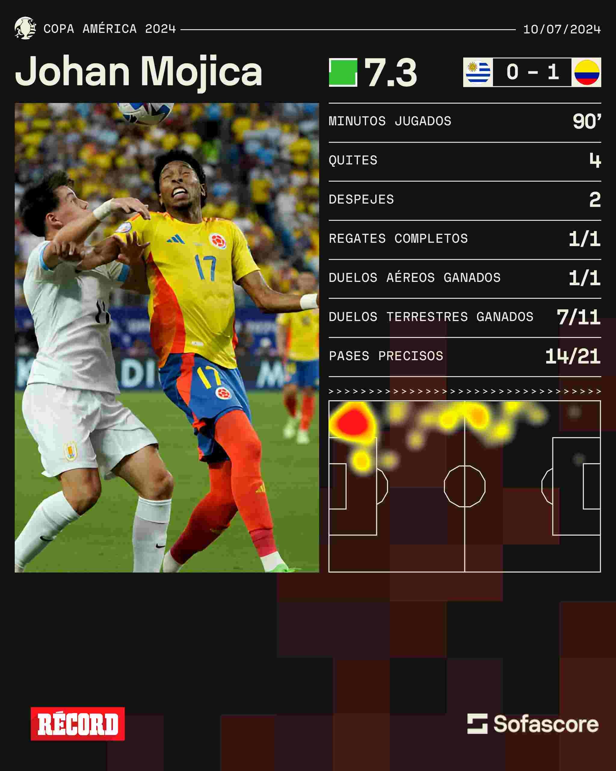 Y apenas cuatro minutos más tarde, Colombia se puso al frente en el marcador. Tras un centro de James Rodríguez desde el tiro de esquina, Jefferson Lerma ganó el duelo aéreo y puso el 1-0 en la pizarra; con esto, James llegó a seis asistencias en esta Copa América, con lo que rompió la marca de Lionel Messi con cinco.
