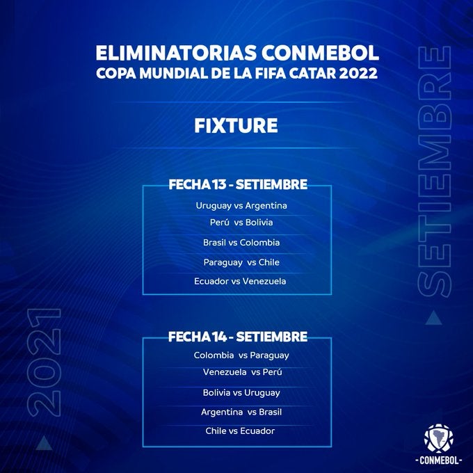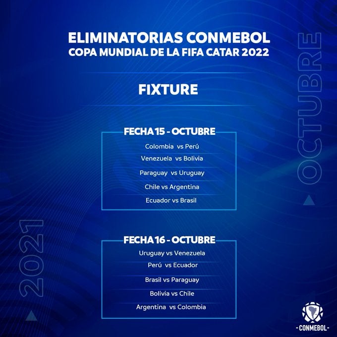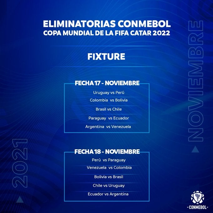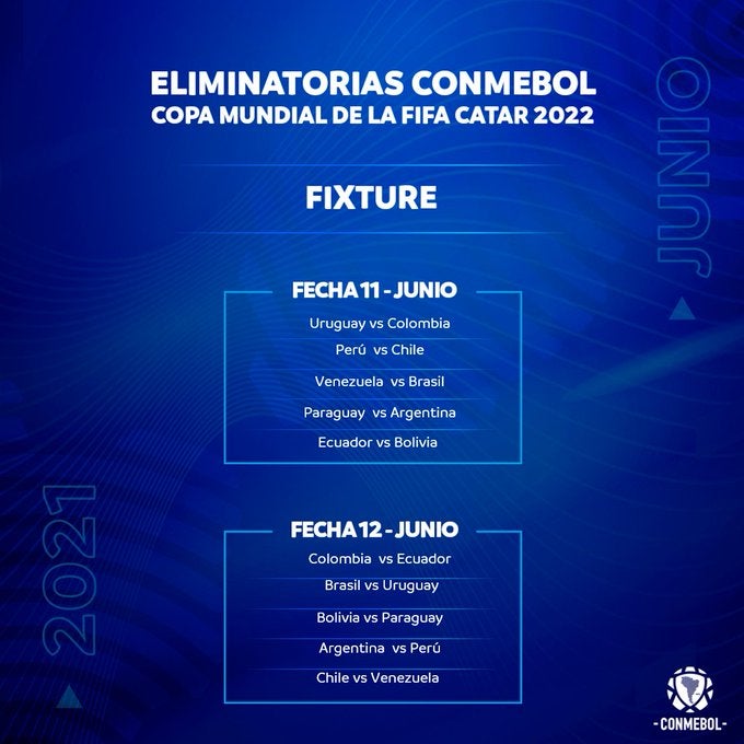 La Conmebol tiene asignados cuatro lugares en la Copa Mundial de Qatar y el quinto clasificado disputará una eliminatoria intercontinental, prevista para los primeros meses de 2022.