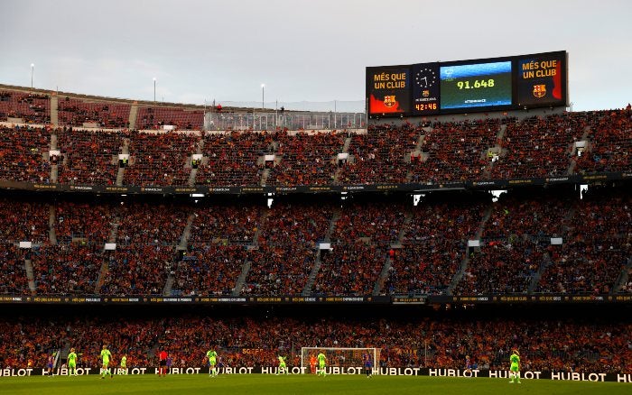 El ambiente volvió a ser espectacular, de noche de gala a pesar de que la luz solar primaveral impregnó el Camp Nou durante todo el encuentro mientras los aficionados levantaban al viento sus banderas con los colores azulgranas y de la enseña catalana prácticamente sin cesar porque el Barça no paró de darles motivos para la alegría.