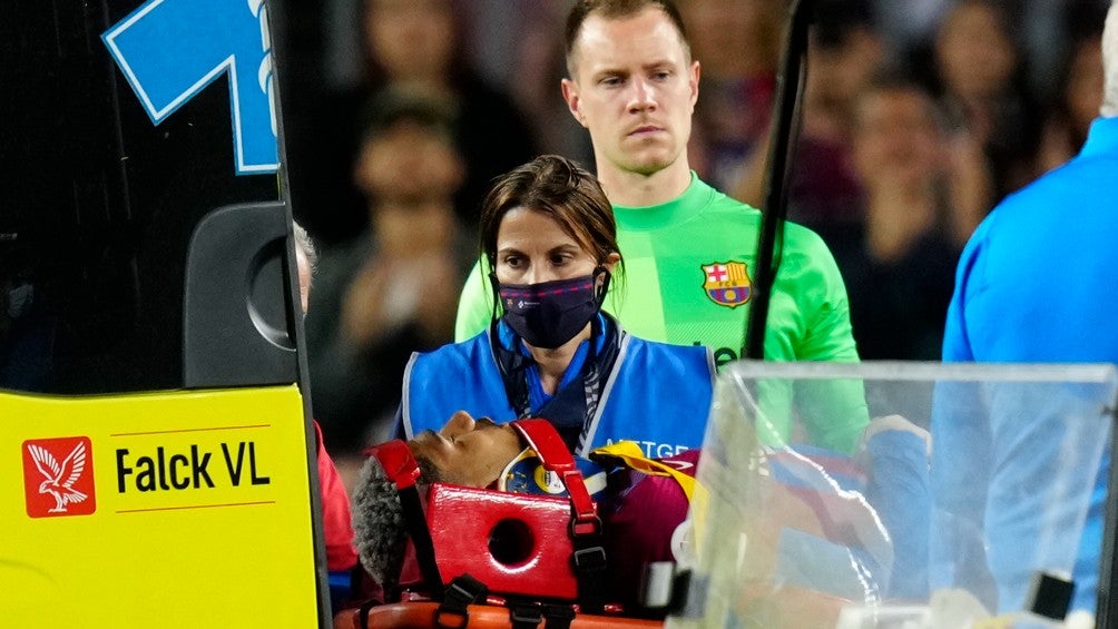 El jugador ingresó unos minutos después en el Hospital de Barcelona, con un collarín para proteger la zona cervical, monitorizado y consciente, y se quedó toda la noche en observación.