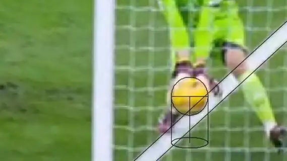 Su revisión se valió de figuras geométricas en una toma lateral, la única en la que ni Lunin ni ningún otro jugador estorbó, para demostrar que, por centímetros, el esférico no cruzó por completo ya que una parte de la "pancita" del mismo quedó mordiendo la línea.