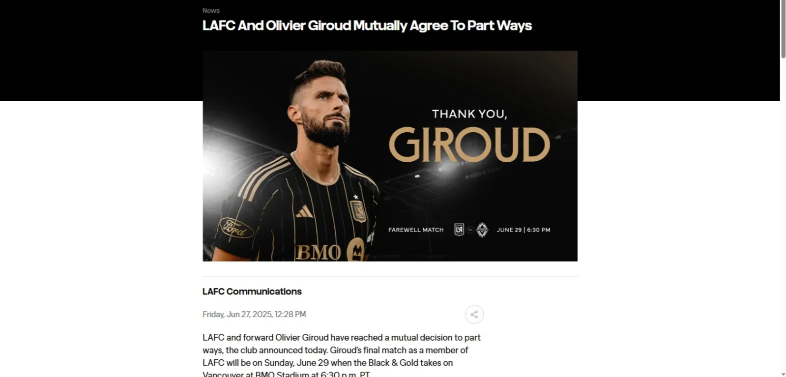 Como decisión de común acuerdo, LAFC y Olivier Giroud han decidido separar sus caminos, así lo hizo oficial el club; al mismo tiempo, también informaron que el delantero francés tendrá un último partido en casa este próximo domingo 29 de junio ante el subcampeón de CONCACAF, Vancouver Whitecaps.