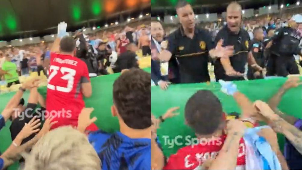 Futbolistas de ambas selecciones se acercaron a la tribuna para tratar de calmar los ánimos, pero Emiliano 'Dibu' Martínez se involucró y brincó sobre la barda para detener a un elemento de seguridad que estaba golpeando a la afición.