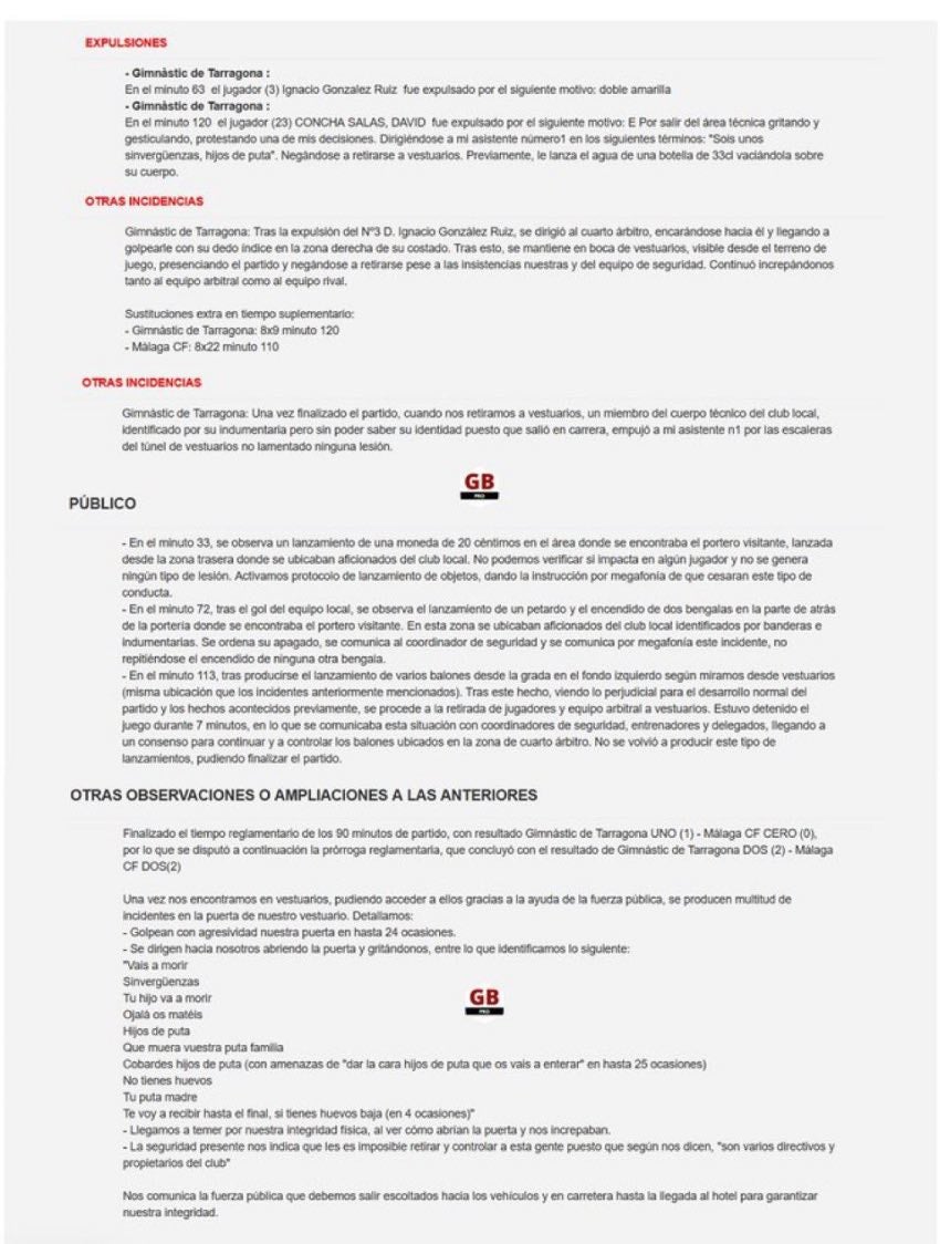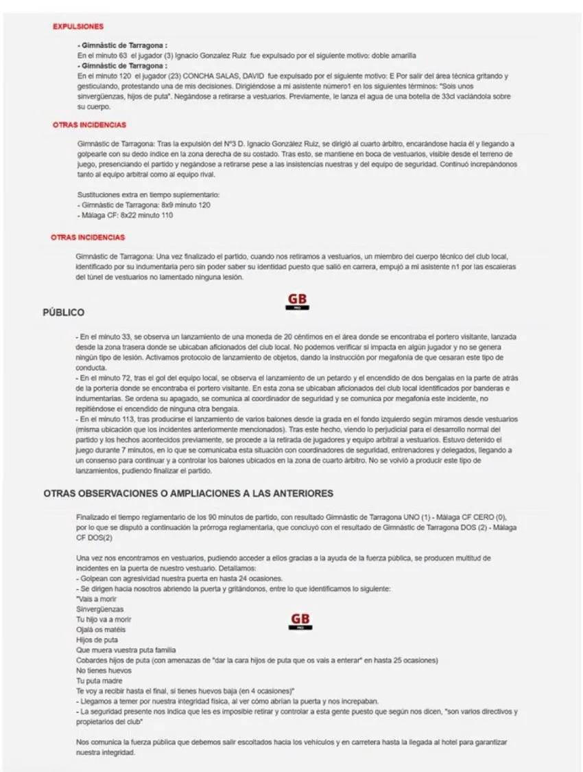 "Una vez nos encontramos en vestuarios, pudiendo acceder a ellos gracias a la ayuda de la fuerza pública, se producen multitud de incidentes en la puerta de nuestro vestuario", menciona el acta del colegiado, que resume algunas de las actitudes en su escrito.