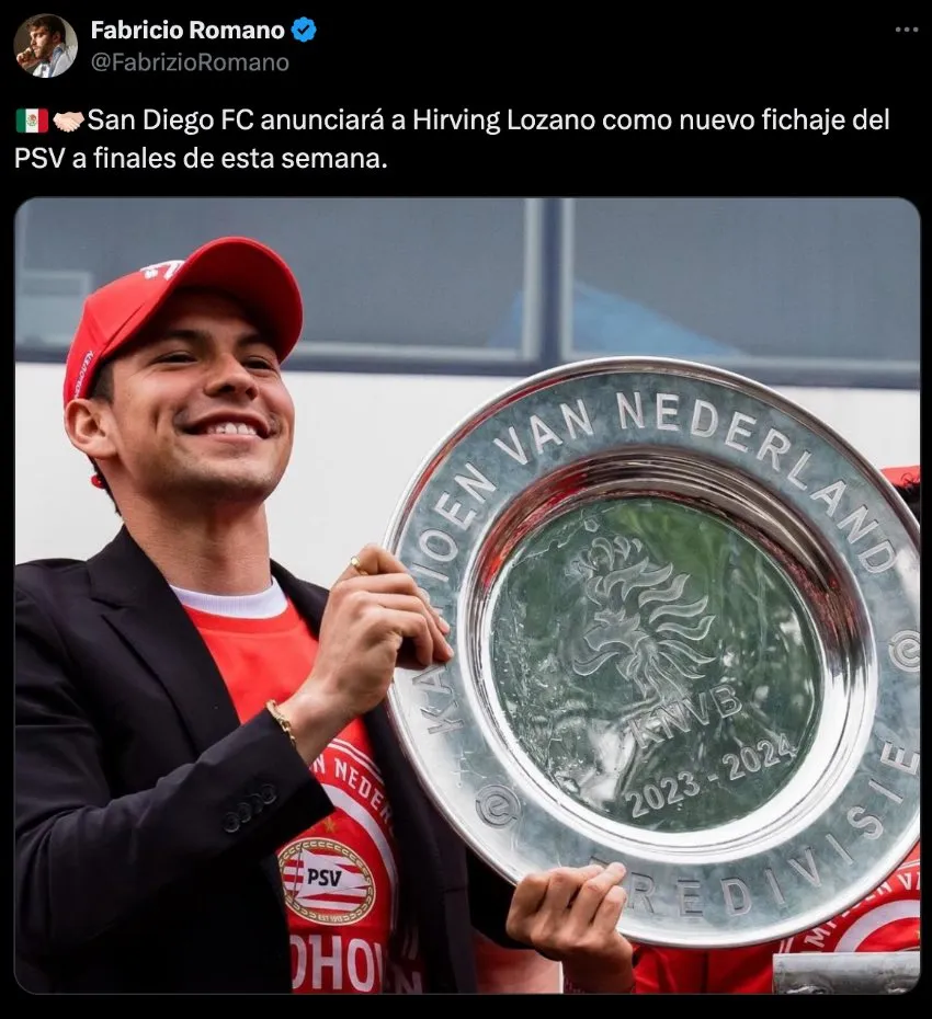 Sin embargo, el mexicano ya podrá ser presentado en San Diego FC, y de acuerdo con Fabrizio Romano, periodista europeo experto en fichajes, será esta misma semana cuando ese anuncio de fichaje llegue a redes sociales. "San Diego FC anunciará a Hirving Lozano como nuevo fichaje del PSV a finales de esta semana", se lee en su cuenta de X.