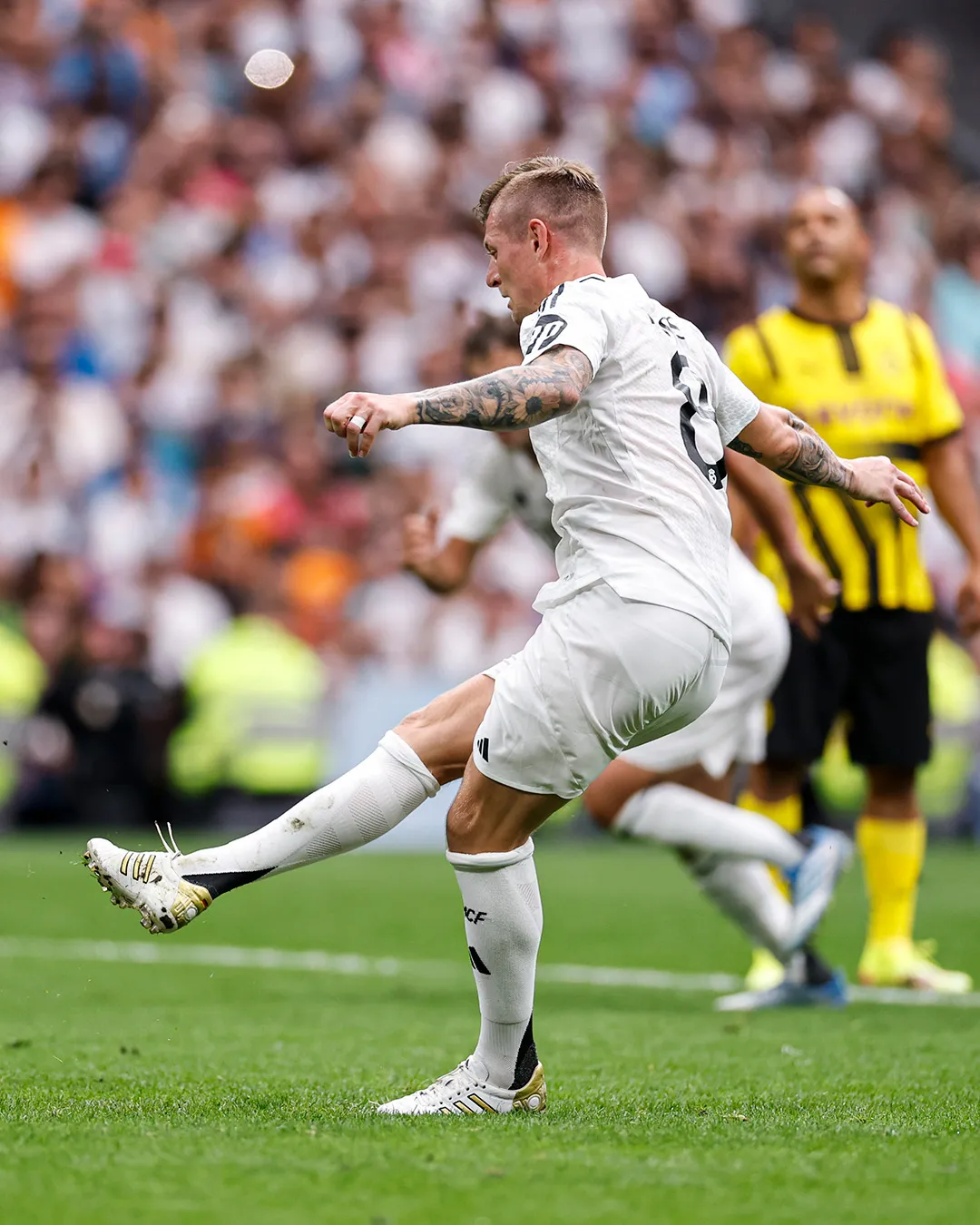 Desde su aparición en el calentamiento, Kroos fue ovacionado por el público. En el minuto 36', con el marcador 1-2 a favor del Dortmund, un penalti sobre Marcelo le dio la oportunidad de brillar de nuevo. El alemán no falló desde los once pasos y puso el 2-2, reviviendo con elegancia su romance con el Bernabéu. Su sustitución en el minuto 84', justo como en su último partido oficial, sirvió como detalle final para rendirle homenaje a su legado.
