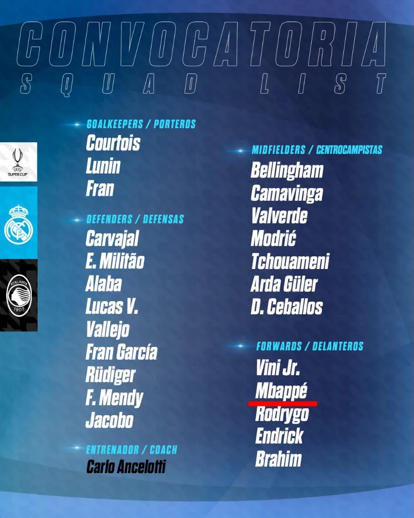 A través de redes sociales, el equipo Blanco dio a conocer su convocatoria para el encuentro, donde Mbppé figura como delantero junto a Rodrygo, Vini Jr, Endrick y Brahim Díaz. Durante a pretemporada, el francés no figuró en su viaje a Estados Unidos por lesión, pero ya se encuentra listo para hacer su debut.