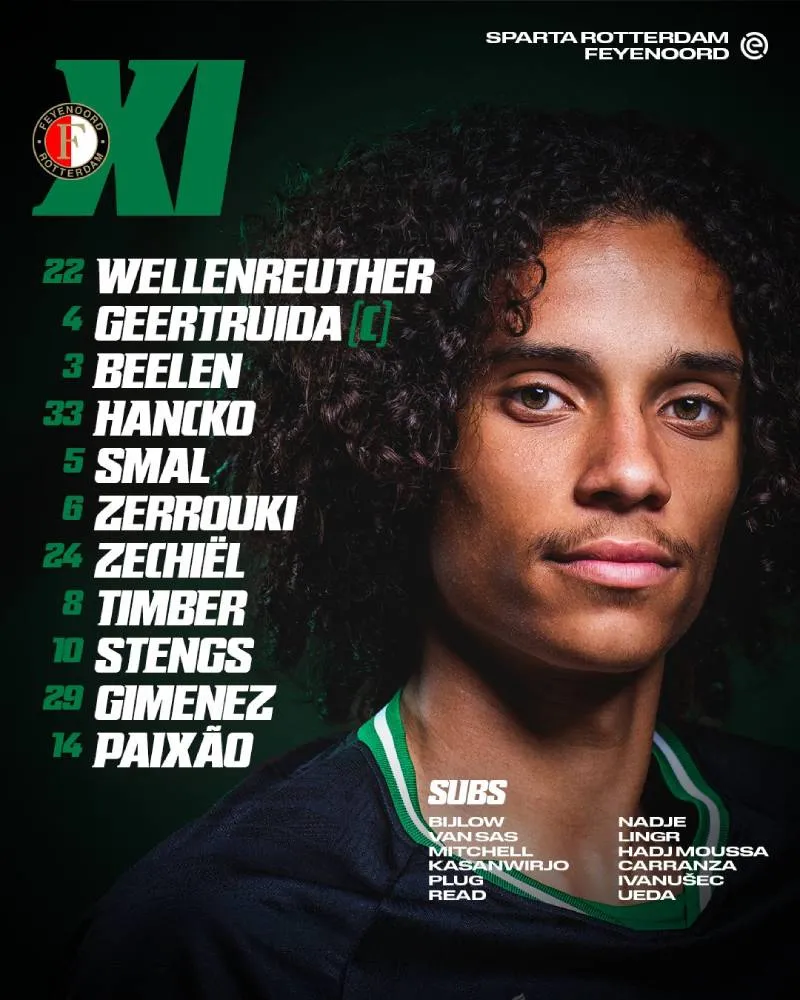 La alineación del cuadro de Feyyenord, con el mexicano Santiago Giménez como titular para el derbi de Rotterdam