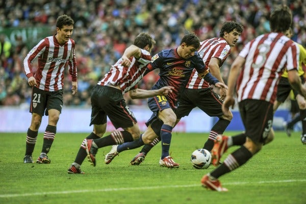 El ';10'; de Barça se mostró muy recuperado con respecto al 4-0 de Munich y empezó a percutir sobre la defensa rival. Con sólo ocho minutos en el terreno de juego, dribló ante San José, Gurpegui y Herrera para acabar batiendo a Iraizoz, y colocar el 1-1.