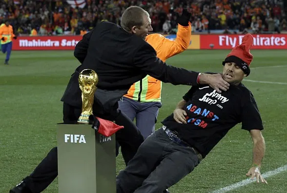 En dicho partido llegó corriendo hasta donde se encontraba el trofeo y quiso ponerle su tradicional gorro, pero varios elementos de seguridad lo atraparon antes de que alcanzara su cometido.