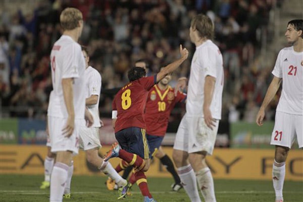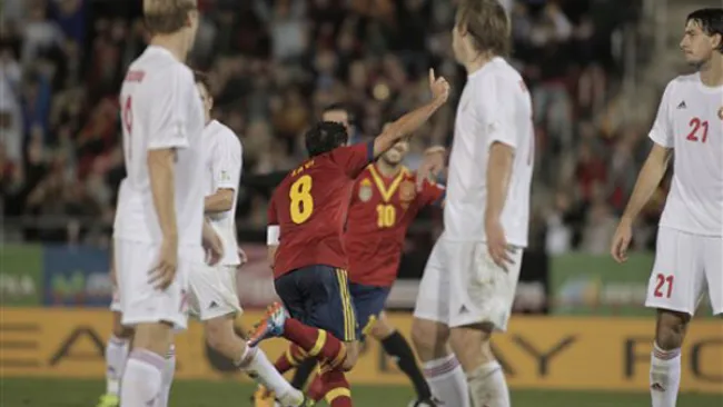 Xavi Hernández y Alvaro Negredo anotaron en el segundo tiempo, y España derrotó 2-1 a Bielorrusia para quedar a un punto de clasificarse al Mundial de 2014.