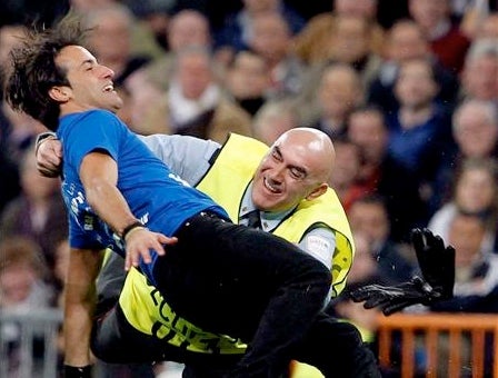 Ataviado con una camiseta de Superman, el espontáneo corrió unos metros antes de resbalarse y ser reducido con una fuerte patada por uno de los guardias de seguridad. Entre empujones fue sacado del campo, que despidió al primer protagonista del duelo con cánticos burlones e insultantes. Después, el partido se reanudó sin más sobresaltos.