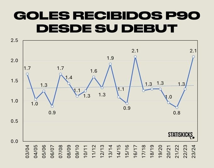 El promedio de goles recibidos por partido de Guillermo Ochoa ha ido en ligero aumento conforme avanza su carrera y esta temporada con Salernitana junto con la 16/17 cuando militaba en el Granda, son las campañas en las que más goles recibe por encuentro, con un promedio de 2.1 cada 90 minutos.
