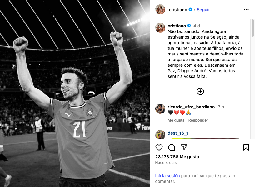 “No tiene sentido. Estábamos juntos en la selección y tú te acababas de casar. A su familia, a su esposa y a sus hijos, les envío mis condolencias y les deseo toda la fuerza del mundo. Sé que siempre estarán con ellos. Descansen en paz, Diogo y André. Los extrañaremos”, escribió el capitán de Portugal.