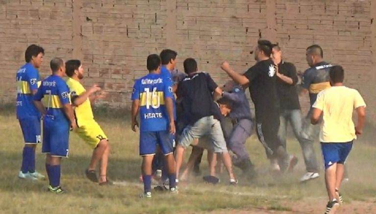 En una liga amateur de Argentina, un grupo de aficionados interrumpió el partido e ingresó al campo de juego para atacar y golpear al árbitro del partido entre Hertelendy y Primero de Mayo, de la Liga de Clorinda, Formosa.