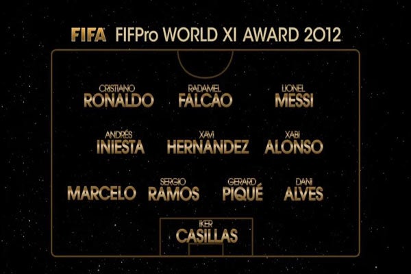 Cinco jugadores del Barcelona (Dani Alves, Gerard Piqué, Xavi Hernández, Andrés Iniesta y Lionel Messi), otros cinco del Real Madrid (Iker Casillas, Sergio Ramos, Marcelo, Xabi Alonso y Cristiano Ronaldo) y el colombiano Radamel Falcao del Atlético de Madrid forman el Once ideal del año, designado en la Gala FIFA del Balón de Oro.