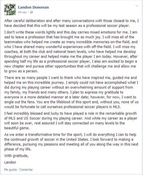 — Landon Donovan (@landondonovan) agosto 7, 2014"Después de una cuidadosa deliberación y muchas conversaciones con las personas más cercanas a mí, he decidido que este será mi último año como jugador de futbol profesional, escribió Donovan.