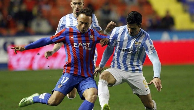 Con un triplete de David Barral, Levante rompió este sábado una racha de 10 partidos sin victoria al golear 4-1 al Málaga, que no presentó al arquero mexicano Guillermo Ochoa en el terreno de juego.