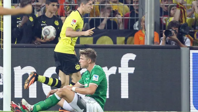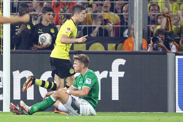 Un gol del delantero polaco Robert Lewandowski dio la tercera victoria de la temporada al Borussia Dortmund, que derrotó con apuros 1-0 al Werder Bremen, en el único encuentro adelantado a la tercera jornada de la Liga de Alemania.