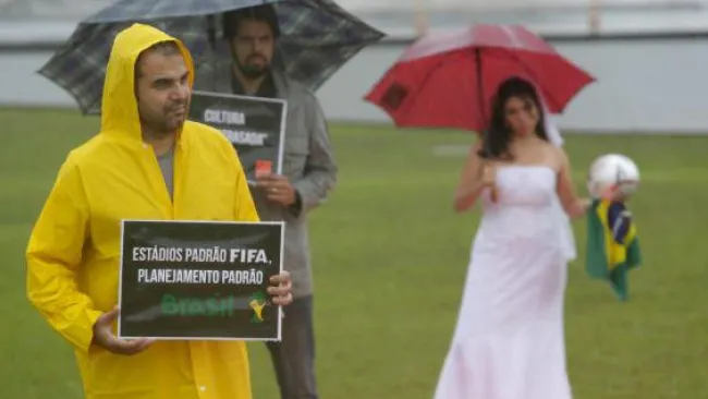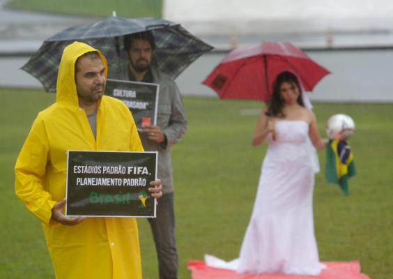 La simbólica protesta fue una respuesta a las declaraciones dadas esta semana por el ministro brasileño de Deportes, Aldo Rebelo, quien comparó el atraso en las obras de los estadios con una novia el día de su boda.