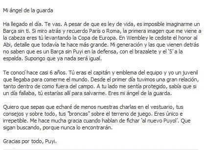 "Quiero que sepas que echaré de menos nuestras charlas en el vestuario, tus consejos y sobre todo tus 'broncas' sobre el terreno de juego. Eres único e irrepetible. Me hace mucha gracia cuando hablan de fichar al 'nuevo Puyol'. Que sigan buscando, porque nunca lo encontrarán. Gracias por todo, Puyi", finalizó.