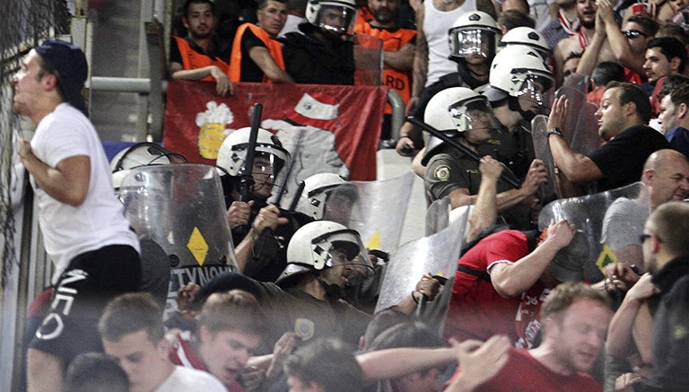 La policía griega agredió a aficionados del Bayern Munich, previo al encuentro de Champions League frente al Olympiacos, en el estadio Georgios Karaiskakis.