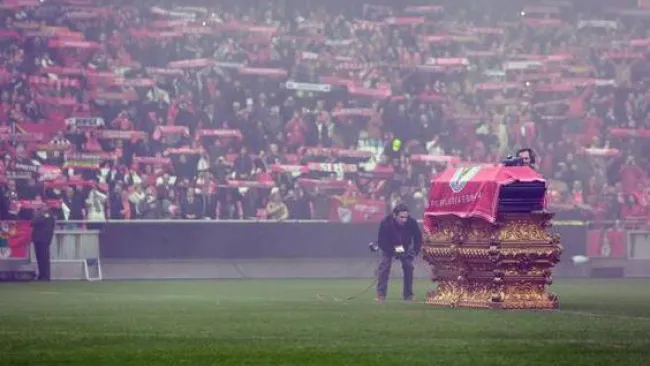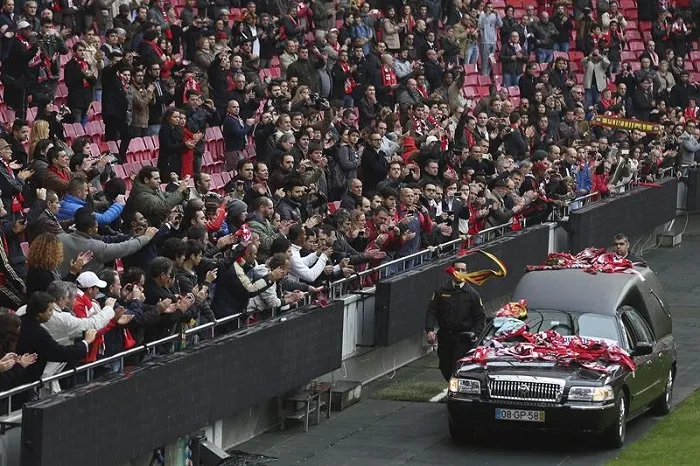 El ataúd donde descansan los restos de 'La Pantena Negra' Eusebio dio una última vuelta por el campo del Estadio Da Luz del Benfica y estuvo a la vista de sus seguidores posando en el centro del recinto sobre un atrio dorado.