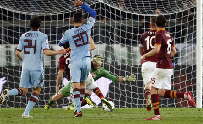 Mattia Destro marcó el primer gol de la Roma a los 41 minutos, también tras asistencia de Gervinho.