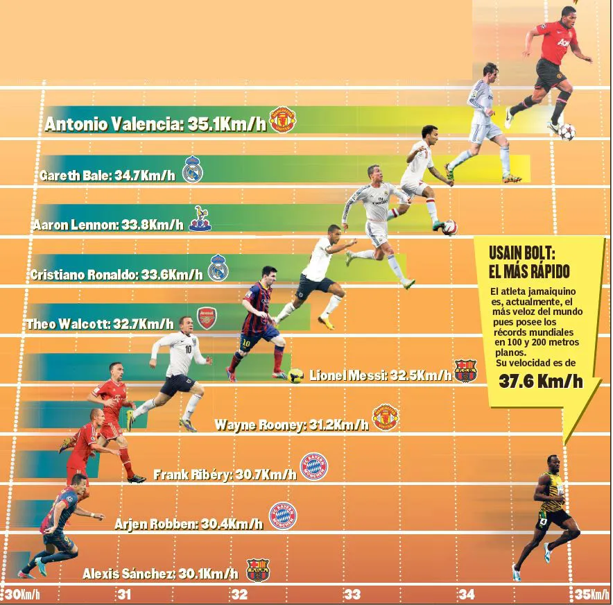 También Leo Messi y Alexis figuran entre los 10 jugadores más rápidos del mundo, según un estudio puesto al día por el organismo.