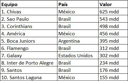 El país con mayor número de equipos en esta lista es Brasil con cinco: Sao Paulo ( que ocupa el segundo lugar con 543 mdd), Corinthians (tercero con 498), Flamengo (sexto con 312), Internacional ( en octavo sitio con 234) y Santos (noveno con 155).