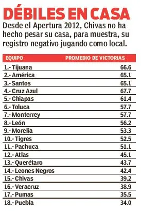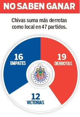 Tales resultados demuestran que su casa no es la fortaleza del equipo rojiblanco. El ataque en casa es de apenas 40 goles. Desde el Apertura 2012, el equipo rojiblanco tiene una marca de 12 partidos ganados, 16 perdidos y 17 empates.