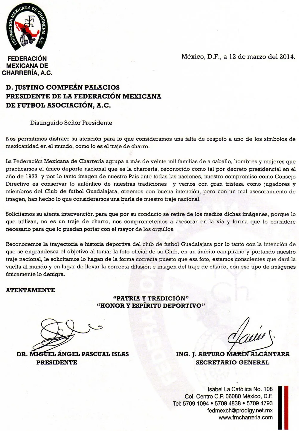 El organismo de Charrería se dirige al presidente de la Femexfut, Justino Compeán, a quien le piden la más pronta resolución al problema que a su parecer es una burla al tradicional traje.