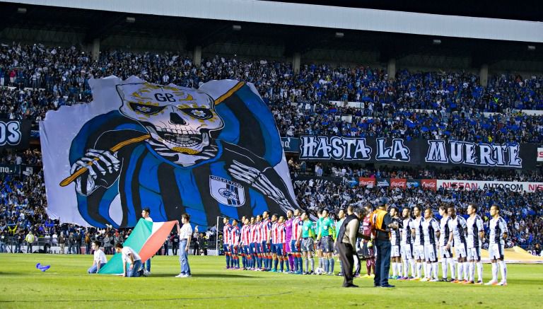 Antes de que se entonara el Himno Nacional Mexicano, los aficionados soltaron un trapo con la imagen de la calaca que sostiene una bandera y tiene la playera del equipo.