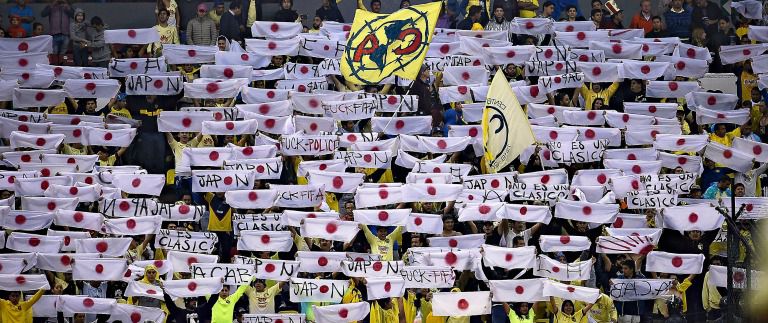 La porra del América 'contestó' a la afición de los Pumas, tras exhibir la pancarta con la leyenda '100 años de trampa', y lo hizo mostrando banderas de Japón.