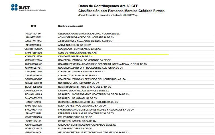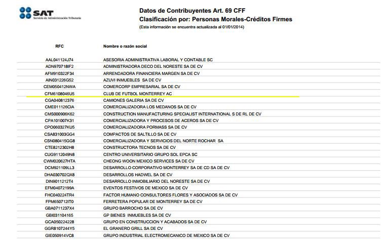 El Servicio de Administración Tributaria dio a conocer el primer día del 2014 una lista donde se detallan a los contribuyentes que no pagan impuestos, en la cual apareció el Club de Futbol Monterrey A.C.