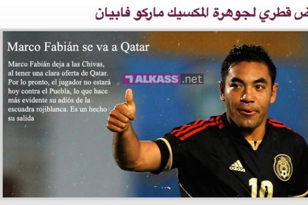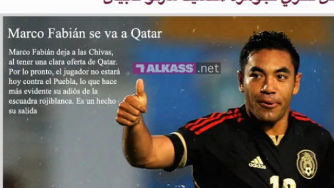 En Qatar se preparan para recibir al "Lionel Messi mexicano". Un medio de comunicación de dicho país —Al Kass— atinó a bautizar con ese apodo a Marco Fabián, aún futbolista de Chivas, pero que a la brevedad podría salir del equipo rumbo a Europa o Medio Oriente tras forzar su salida, según el presidente Jorge Vergara.