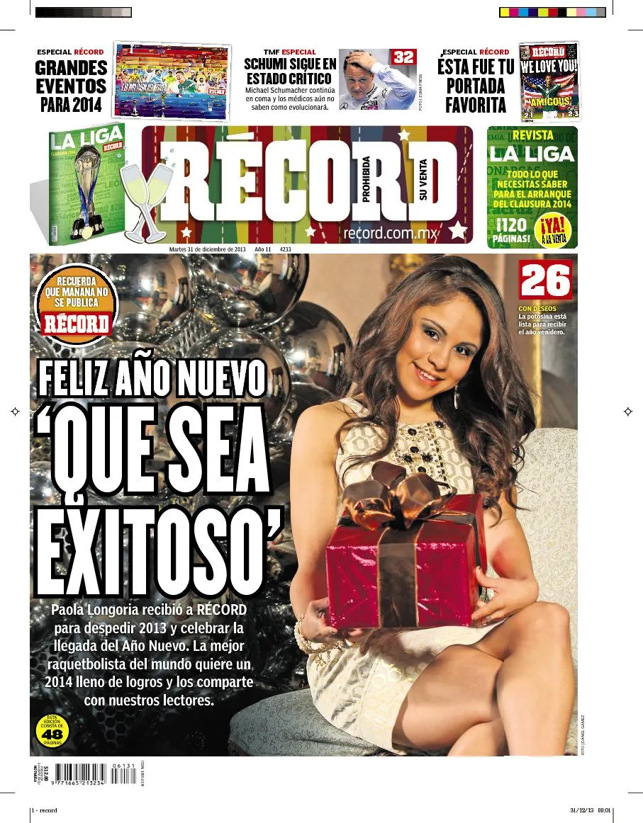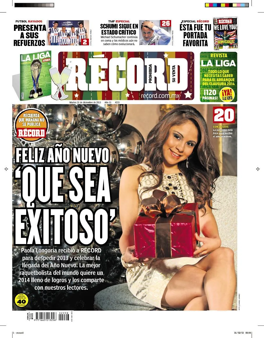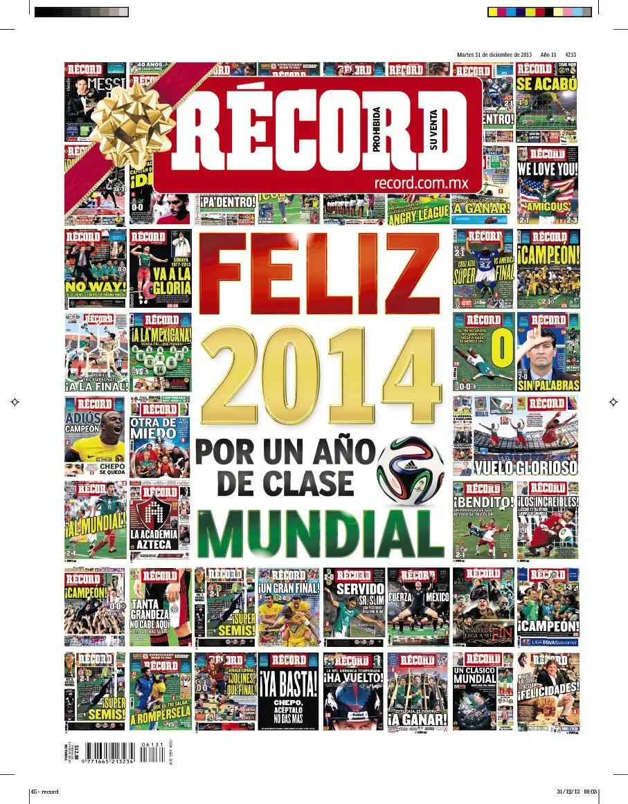 En día de portada doble para sus versiones en el DF, Guadalajara y Monterrey, la edición RÉCORD del martes 31 de diciembre te desea un feliz y emocionante 2014, al tiempo que presentamos un recuento de los sucesos más importantes del año que termina en el mundo deportivo, con los dibujos y animaciones de sus protagonistas.