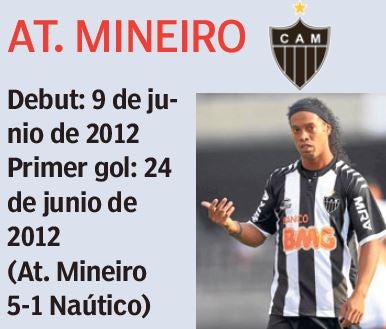 Su último debut antes de llegar a nuestro país fue con el Atlético Mineiro, cuadro con el que ganaría la Copa Libertadores de América. En esta ocasión, Dinho tardó 15 días en hacer gritar un gol a los aficionados, cuando fue parte de la goleada al Naútico.