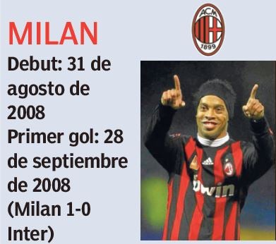 Tras su época dorada en Catalunya, Ronaldinho arribó a Milan para jugar con el cuadro rossoneri. Su primer gol llegó casi un mes después de su debut, pero para su fortuna, fue en el Derbi de la Madonnina frente al Inter. El gol significó la victoria por la mínima para su equipo.