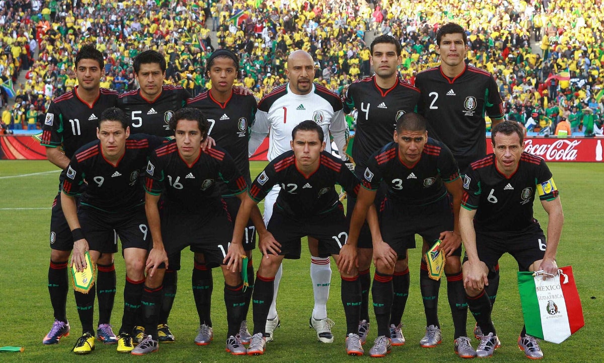 SUDÁFRICA 2010: Para el primer Mundial que se realizó en África, hubo un par de modificaciones en el uniforme del Tricolor. En el principal, las calcetas dejaron de ser rojas para convertirse en blancas; pero el cambio más significativo fue que por primera ocasión México vistió de negro en el duelo inaugural ante el anfitrión Sudáfrica y fue el combinado nacional el que saltó al terreno de juego con un uniforme completamente negro con vivos en verde y rojo por primera vez en su historia.