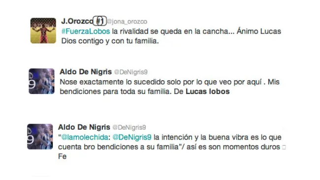 Al tiempo el también jugador de Rayados y seleccionado nacional, Aldo de Nigris, se mostró preocupado por lo sucedido con la familia del elemento de Tigres: "@DeNigris: Nose exactamente lo sucedido solo por lo que veo aquí. Mis bendiciones para toda su familia. De Lucas lobo" (sic).