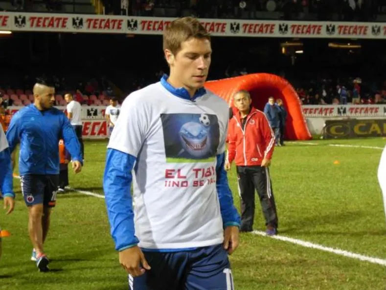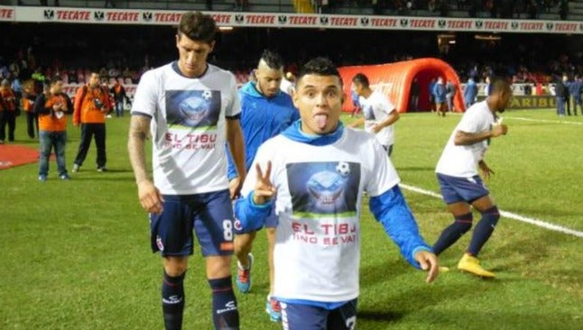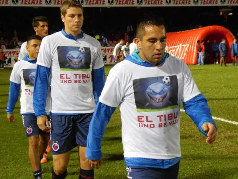 Jugadores de Veracruz saltaron a calentar este viernes al terreno de juego del Luis 'Pirata' Fuente con playeras que mostraban la leyenda El Tibu no se va' y la imagen de un tiburón animado.