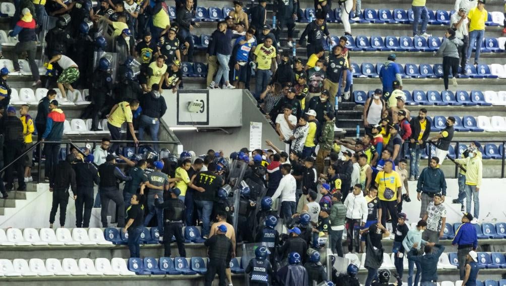 Fue en la parte alta del lado norte, donde entre los mismos fanáticos azulcrema comenzaron a golpearse e incluso intercambiaron golpes con la policía que se encontraba en el lugar.