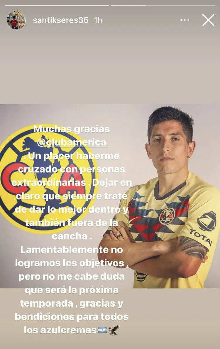 "Muchas gracias Club América, un placer haberme cruzado con personas extraordinarias. Dejar en claro que siempre trate de dar lo mejor dentro y también fuera de la cancha. Lamentablemente no logramos los objetivos, pero no cabe duda que será la próxima temporada, gracias y bendiciones para todos los azulcremas", escribió en Instagram.