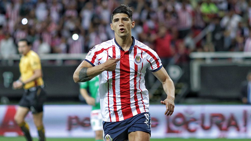 Alan Pulido celebra este domingo, en el debut de Chivas en el Apertura 2019 ante Santos, un centenar de partidos oficiales como jugador rojiblanco.
