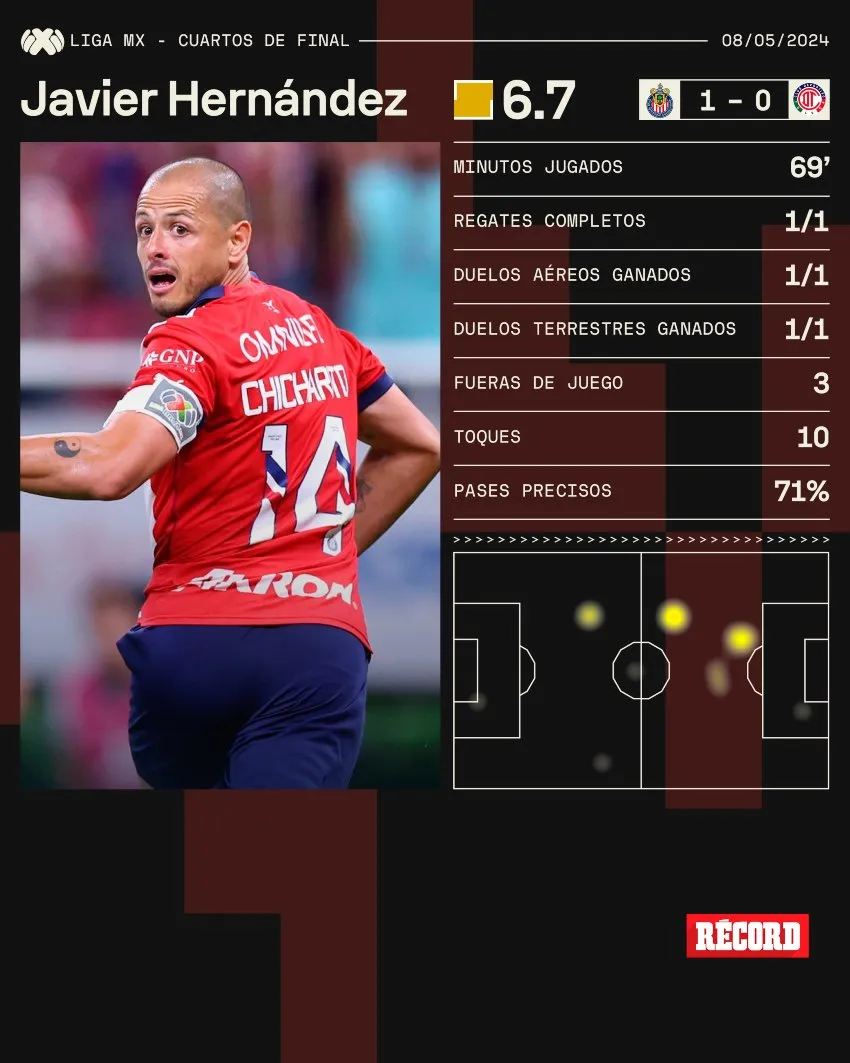 Javier 'Chicharito' Hernández, delantero de Chivas, fue uno de los jugadores titulares que menos toques de pelota tuvo en el cotejo del Rebaño Sagrado ante los Diablos en los Cuartos de Final del Clausura 2024.