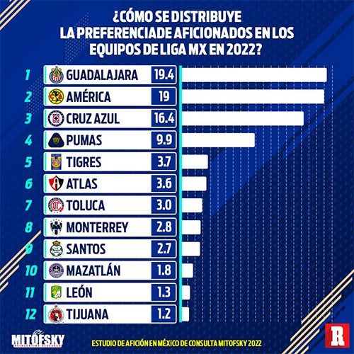 Aunque en los últimos torneos no le ha ido muy bien, Chivas le arrebató el liderato al América después de cuatro años, específicamente desde 2018, aunque cabe señalar que en 2021 no se realizó esta encuesta.